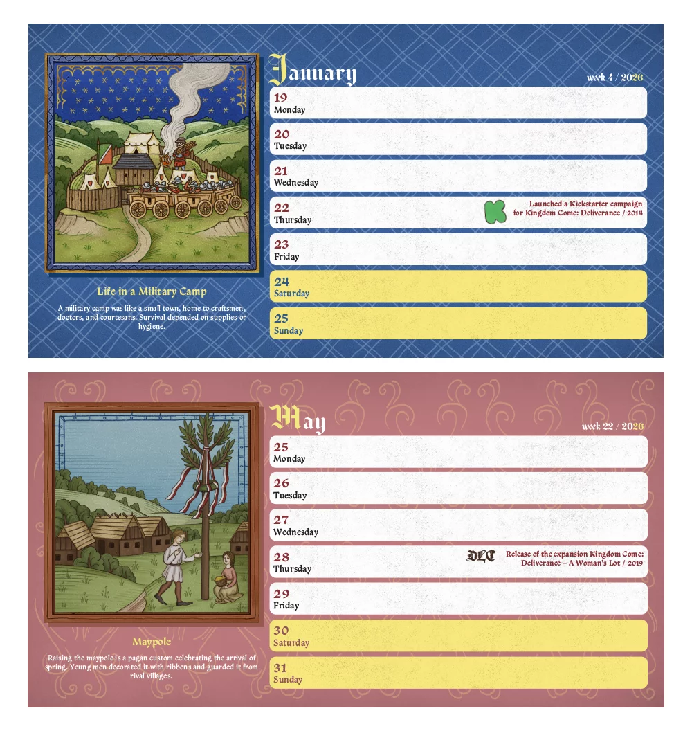 Experience the year 2026 in a true medieval rhythm with the official Kingdom Come: Deliverance II desk calendar. Each week is accompanied by an illustration from the game’s codex, offering fascinating insights into medieval life, from battles and camp routines to holidays and customs of the Bohemian lands.