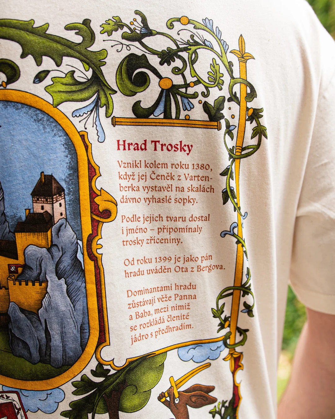 Step into the heart of the Bohemian Paradise with a T-shirt inspired by the legendary Trosky Castle. The illuminated design, reminiscent of medieval manuscripts, captures both the beauty and the story of this iconic ruin, now brought to life in the world of Kingdom Come: Deliverance II.